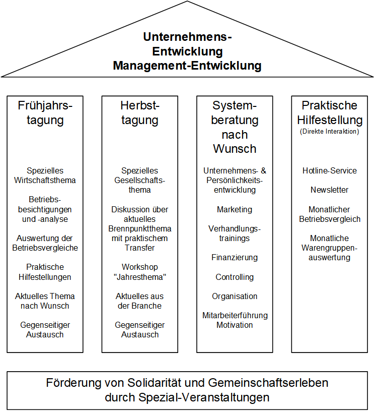 Seit über 25 Jahren leite ich Erfahrungsaustauschgruppen verschiedener Branchen und habe hierzu das folgende 4-Säulen-Konzept erarbeitet.